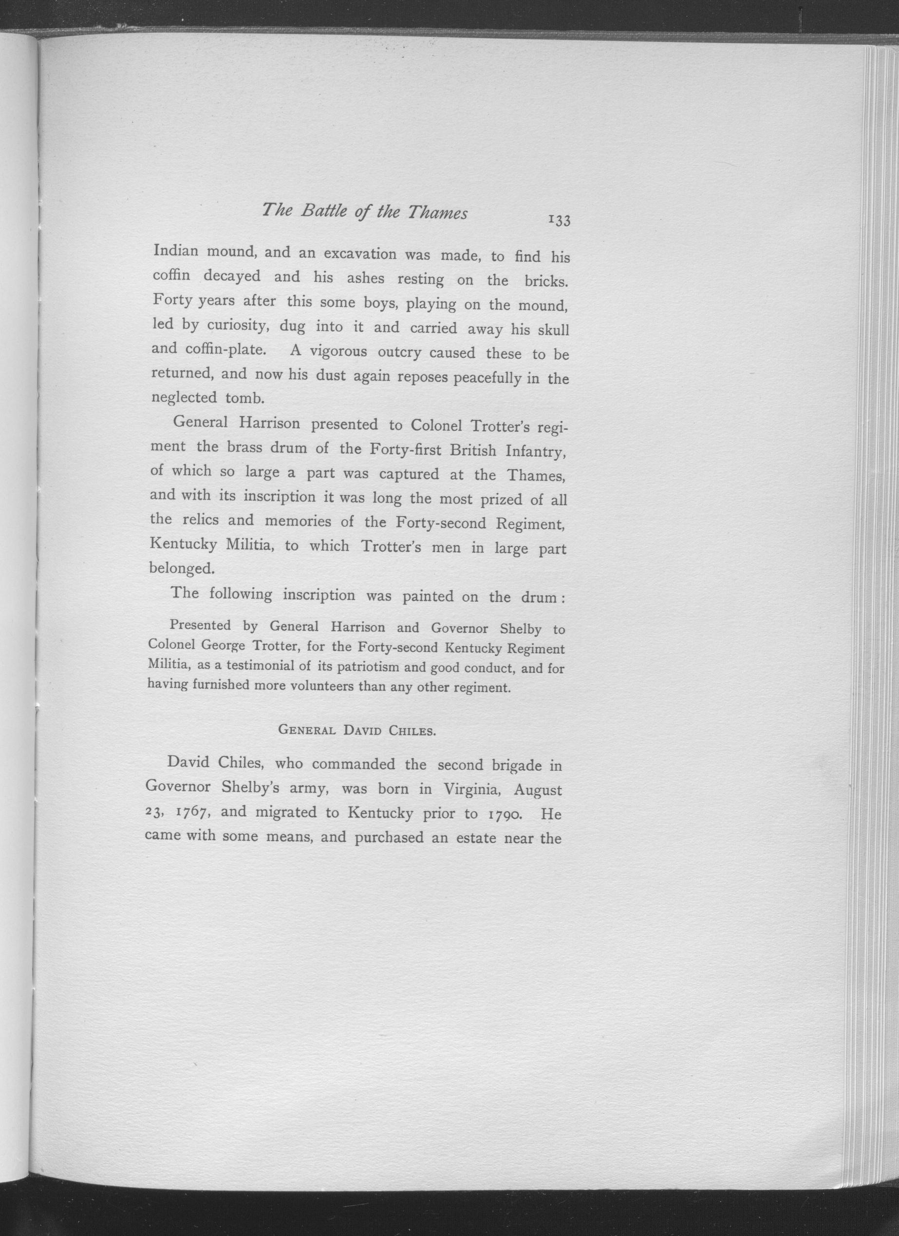 David Chiles, who commanded the second brigade in Governor Shelby's army, was born in Virginia, August 23, 1767, and migrated to Kentucky prior to 1790.  He came with some means, and purchased an estate near the town of Minerva, in Mason County, close to the Bracken County line.  From the profusion of cane found on his place he called it 'Caneland'.  It is the highest point between Vanceburg and Newport, Kentucky.