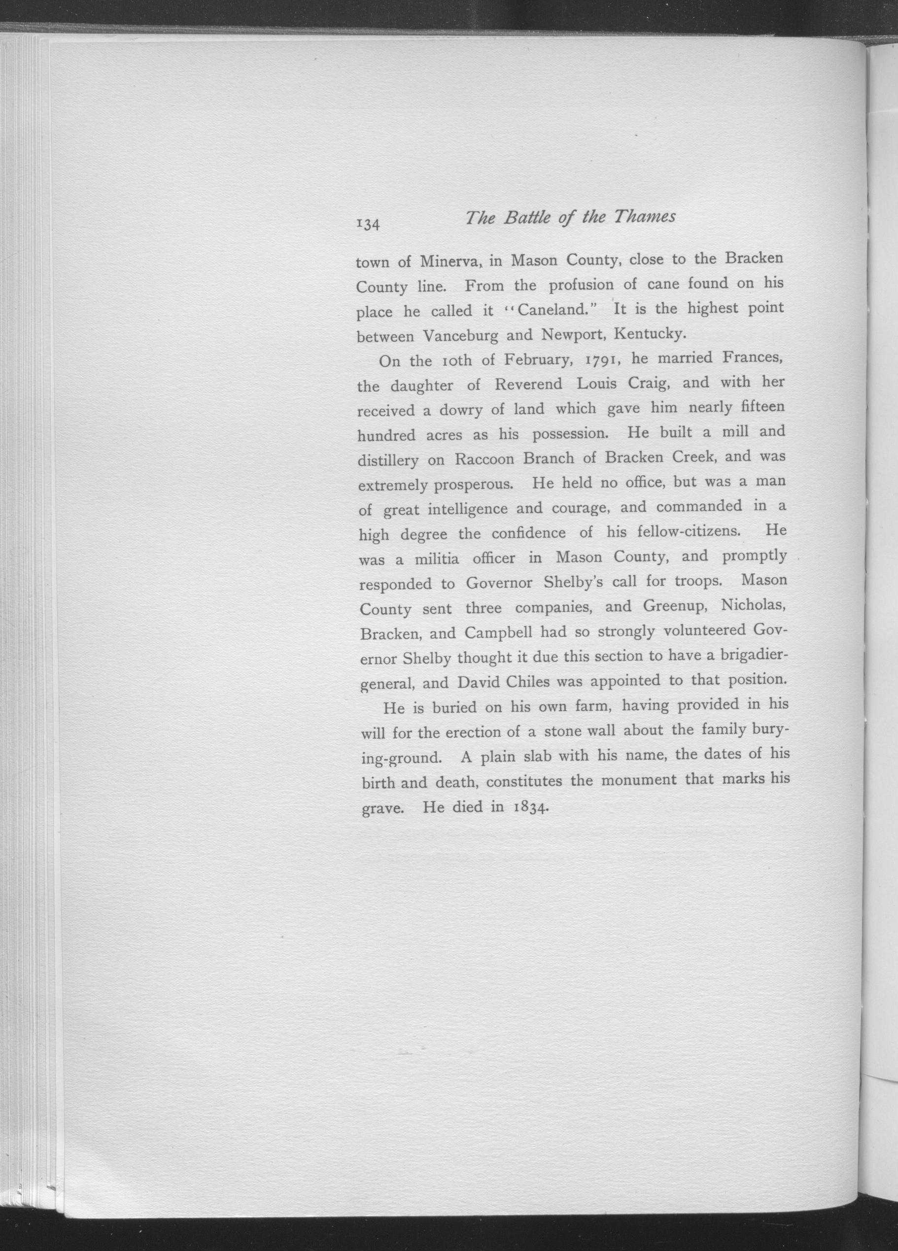 On the 10th of February, 1791, he married Frances, the daughter of Reverend Louis Craig, and with her received a dowry of land which gave him nearly 1500 acres as his possession.  He built a mill and distillery on Raccoon Branch of Bracken Creek, and was extremely prosperous.  He held no office, but was a man of great intelligence and courage, and commanded in a high degree the confidence of his fellow-citizens.  He was  a militia officer in Mason County, and promptly responded to Governor Shelby's call for troops.  Mason County sent three companies, and Greenup, Nicholas, Bracken, and Campbell had so strongly volunteered Governor Shelby thought it due this section to have a brigadier-general, and David Chiles was appointed to that position.