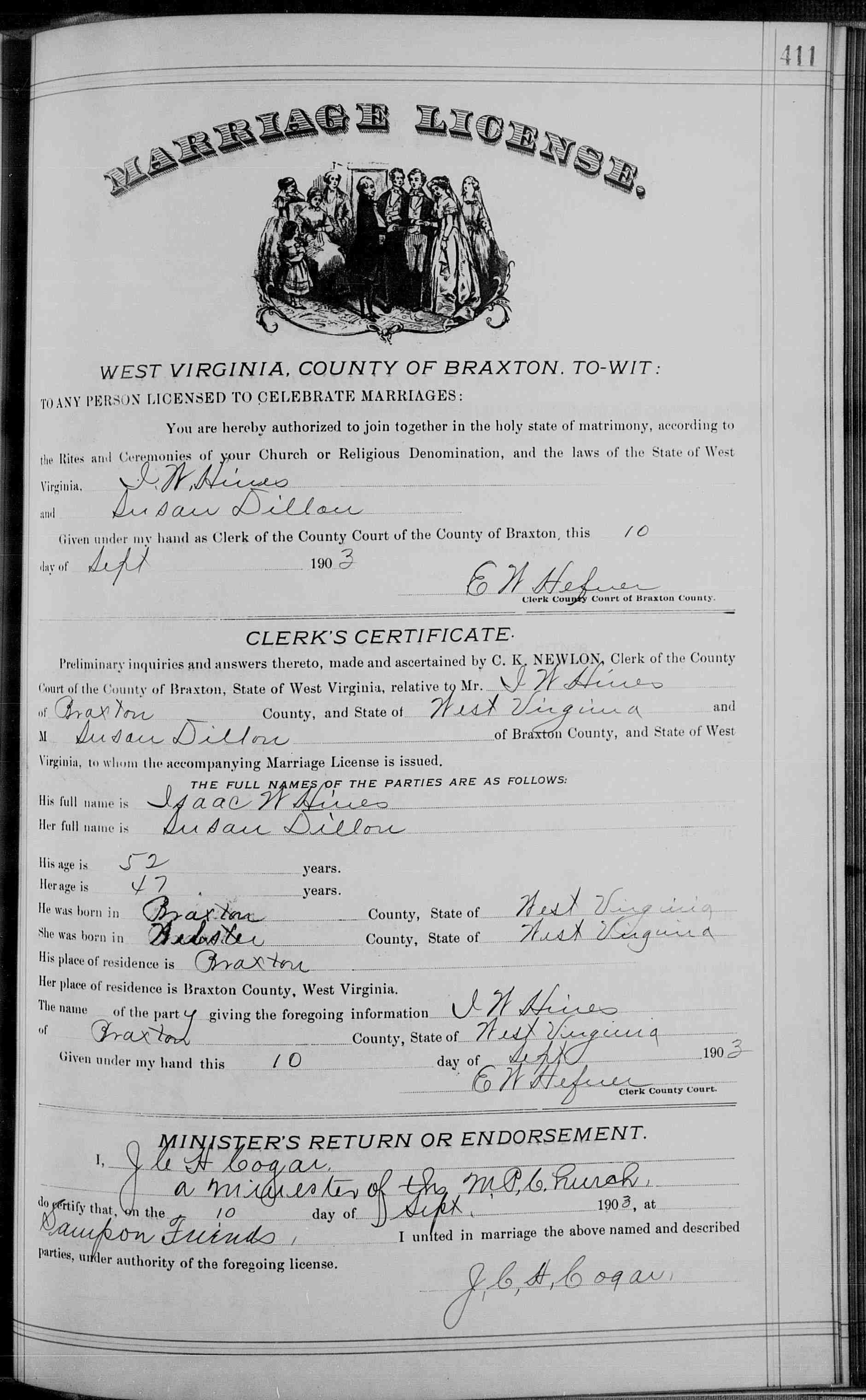 Preliminary inquiries and answers thereto, made and ascertained by C. K. NEWLON, Clerk of the County Court of the County of Braxton, State of West Virginia, relative to Mr. I. W. Hines of Braxton County, and State of West Virginia and M Susan Dillon of Braxton County, and State of West Virginia, to whom the accompanying Marriage License is issued.
