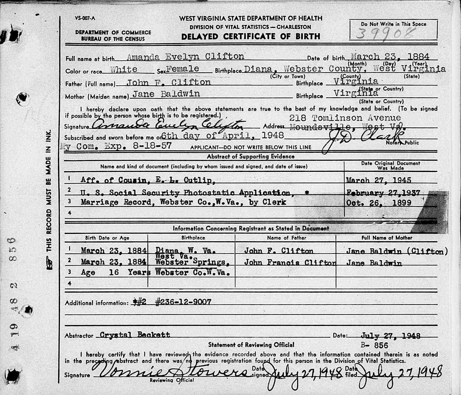 Delayed Birth Certificate of Amanda Evelyn Clifton
