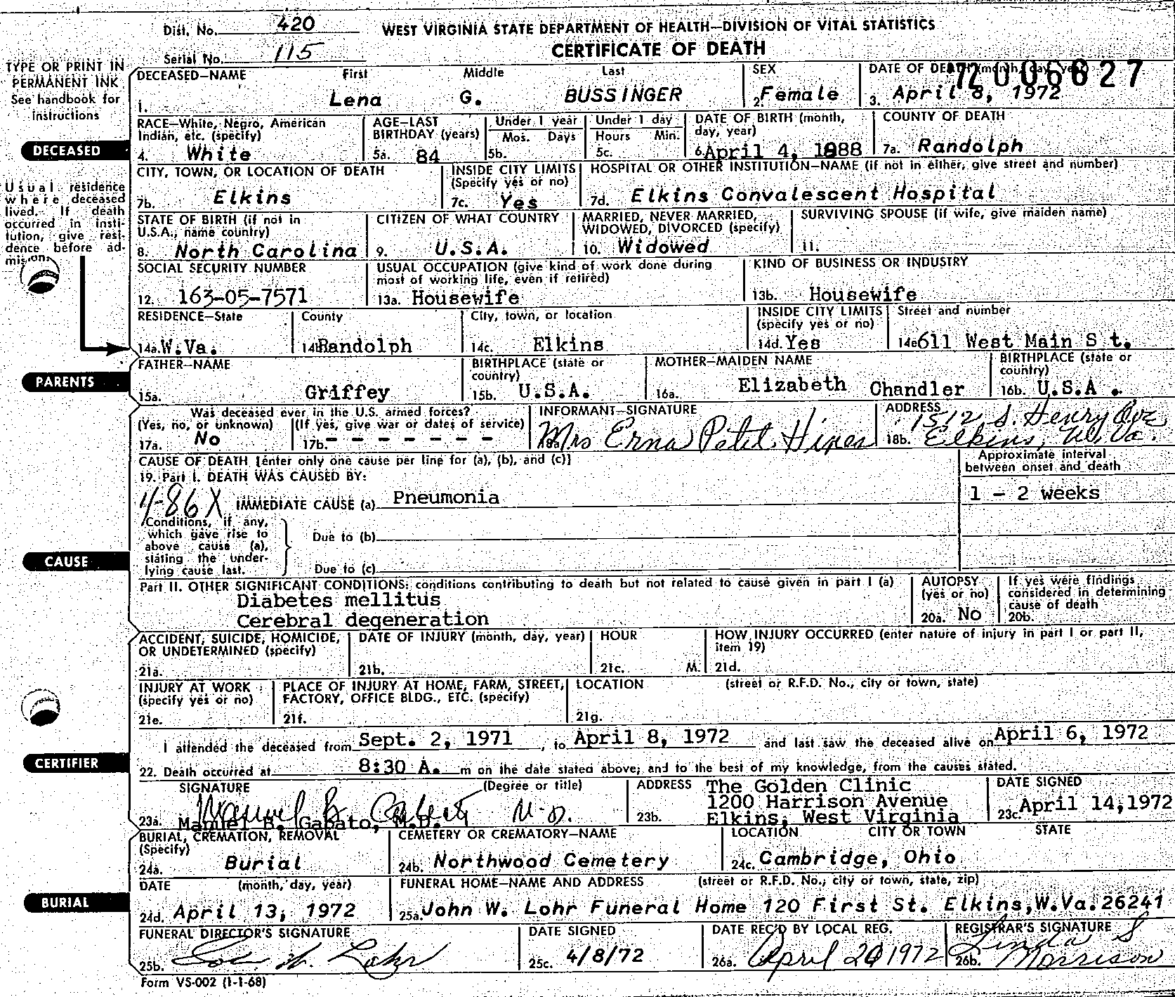 Death Certificate of Lena Griffey Pettit Bussinger - 1972