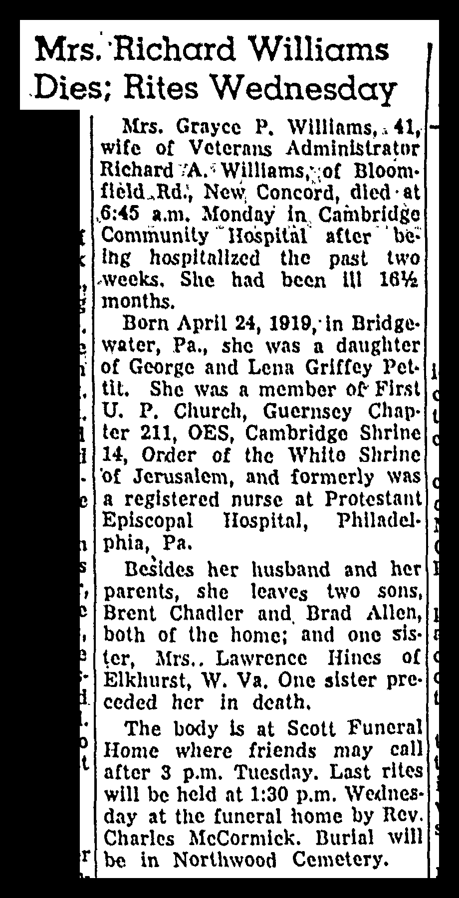 Mrs. Grayce P. Williams, 41, wife of Veterans Administrator Richard A. Williams, of Bloomfield Rd., New Concord, died at 6:45 a.m. Monday in Cambridge Community Hospital after being hospitalized the past two weeks.  She had been ill 16 1/2 months.